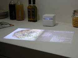 ネットワーク接続に対応しており、スマホやタブレットと連携して手軽に端末内の画像を投影できることが特徴。防水仕様も備えており、キッチンや浴室などでも使用できる。なお、まだ試作機の段階で、日本における具体的な製品化は語られていない。