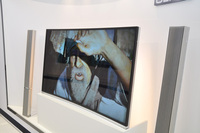ラック型の4K超短焦点プロジェクター「Life space UX」は、真ん中のプロジェクター部のほか、左右に配置するスピーカーユニット部と、BDレコーダーなどを収納できるキャビネット部で構成されるモデル。撮像素子に0.74型の4K SXRDパネルを3基使用し、投写方式は3原色液晶シャッター方式を採用。レンズは約1.6倍の電動ズームに対応している。3日に行われたプレスカンファレンスでは、ヨーロッパでも来年夏から販売を開始することが明らかにされた(関連ニュース)。