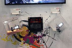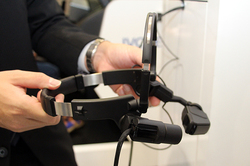 「ニアアイ ディスプレイ(仮称)」は1280×720ピクセルの高精細で図面等のデータを表示できるウェアラブルデバイス。取り外し可能なカメラ部とディスプレイ付きヘッドセットで構成されている。両手が空くので、工場の在庫整理等での活用などを提案。既に同社山形工場などで試験運用中で、そこでのデータも含めて最終仕様を決定する考えだという。