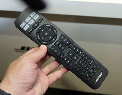 外部音声入力はアナログ音声×1、光デジタル音声×1、同軸デジタル音声×1で、テレビと1本のケーブルでシンプルに接続できる。付属のユニバーサルリモコンを使えば、テレビのほか周辺機器の基本操作も行える。また、本体には低音の量を調節できる専用ノブも設けた。