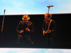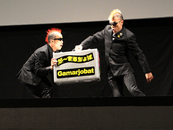 いよいよ、ここから新製品の発表パートにうつった。パフォーマンスを行ったのは、パントマイムユニットのが〜まるちょば。アタッシュケースを持つおなじみの芸など、ステージ上から息の合ったプレイを見せ、笑いを誘っていた。パフォーマンスの終盤には、ヘッドホンを持ち出して、装着すると周囲の音が聞こえなくなるというノイズキャンセリングヘッドホンの特徴を、巧みにパントマイムで表現した。