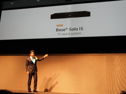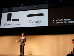 まず挽野氏は、昨年のBose IMPACTで、「Sound LInk Mini」を発表したことに触れ、「ボーズは、今度はテレビのサウンドを変える」と力を込めて紹介したのは「CineMate 15」だ。9月26日に発売する。「CineMate 15をテレビの前に置くだけで、テレビの前が驚くほどの劇場空間になる」とアピールした。