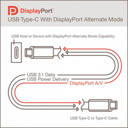 DisplayPort Alt Modeでは、USB 3.0/3.1が持つ4つのレーンのいくつかもしくは全てを使って、DisplayPortの映像や音声信号、AUXチャンネル、HPD機能を利用できるようになる。4Kディスプレイにも対応。4つのレーン全てを使った際は、5Kディスプレイを使いながらUSB2.0データ伝送を行うことも可能とのこと。