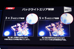 バックライトには直下型の高輝度白色LEDを採用。IPSパネルはネイティブコントラスト比がVAに比べて低いこともあり、ローカルディミングが効果を発揮する。ローカルディミングの分割数は100分割以上。「3×3」から「5×5」のエリア制御になり、より滑らかなディミングが可能になったという。またコントラスト感を高め黒を沈めるための試みでは、LEDドライバーを新規設計したほか、ローカルディミングアルゴリズムも再構築。また高透過率であるIPSの黒浮きを考慮し、ガンマ設計の見直しも行っている。