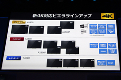 今回発売するAX900シリーズとAX700シリーズの型番と想定売価は以下の通り。なお、AX900シリーズは85/65/55型を用意し、基本デザインは画面が傾斜したスラントデザイン。55型のみ、通常スタンドを備えたフラットデザインのAX900Fを用意する。AX700は型番にFが付いていないが、すべてフラットデザインとなる。