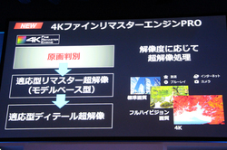 超解像処理も進化。新チップ「4KファインリマスターエンジンPRO」を搭載することで、2K放送なども高画質化する。具体的には、SDからフルHDや4Kにアップコンされた映像でも、原画の解像度を自動判別し、最適な超解像処理を行うことで高画質化するというものだ。