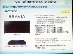 本サービス対応チューナー内蔵テレビを発売するのは、シャープ、東芝、ソニー、LG、パナソニックの5社。シャープは“AQUOS”UD20/US20/U20の3ラインがサービスイン当日の10月27日から対応し、東芝は“REGZA”Z10X/J10Xが、ソニーは“BRAVIA”X9500B/X9200B/X8500Bと、4KメディアプレーヤーのFMP-X7が2015年春のアップデートによって対応する。なお、ソニー製テレビがひかりTVチューナーを内蔵するのは初めて。