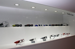 特徴は小型・軽量(参考展示品は本体のみで42g)で、メガネとしての外観や装着感を追求し、普通のメガネのように使える点。様々なシチュエーションでもかけやすくした。ブースには、様々なデザインの東芝グラスも展示され、自由度の高さをアピールしていた。