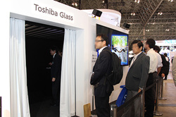本日から11日まで幕張メッセで開催される「CEATEC 2014」。東芝は、メガネ型ウェアラブル端末「東芝グラス」を参考出展していた。