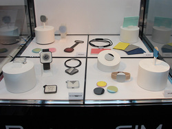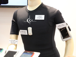 次にウェアラブルデバイス分野では、伝導性複合素材hitoeを使用したウェア型デバイスや、皮膚アセトン測定できる小型端末、触覚を通じた新感覚デバイス「YUBI NAVI」など、幅広い“ウェアラブルの形”を訴求している。