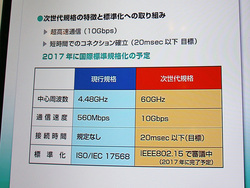 次世代TransferJetは、60GHz帯を使用した10Gbpsの超高速通信に対応するという。IEEE802.15で審議中であり、2017年に国際標準規格化する予定。現行規格で特に規定を設けていなかった接続時間も、次世代規格では20msec以下に設定し、短時間のコネクションを目標としている。