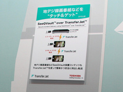 また、今回のブース内では、新規格“SeeQVault”と組み合わせたシステムも提案している。例えば、同規格対応機器内に保存されている地デジ録画コンテンツを、TransferJetを使って短時間で簡単に対応スマホ/タブレットへ持ち出し転送するといったようなことも実現できるようになる。