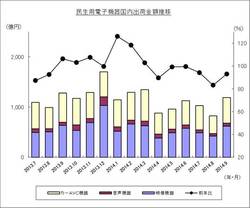 一般社団法人 電子情報技術産業協会(JEITA)は、民生用電子機器の9月度国内出荷金額を発表した。全体では前年比93.0%の1,191億円で、6ヶ月連続で前年比マイナスとなった。
