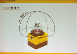 SP360は、コダックのフィルム箱に透明なドームを設けたような外観。このドームの中に特殊なレンズが入っており、水平方向360度、垂直方向214度の撮影を可能にする。撮影した映像は、専用編集ソフトで見ることができる。