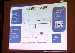 入力端子や接続できる機器群の幅広さも特徴。ヘッドホン出力端子は8〜600Ωまで対応し、端子形状は3.5mmステレオミニ。またOPTICAL入力とCOAXIAL/LINE入力兼用端子も3.5mmミニジャックで装備した。USB MicroB端子では、Mac/Win/Android(OTG)からの入力に対応。またUSB A端子はiOSデバイス向けで、Lightning-USBアダプターを介すことなく、DSD 5.6MHz音源や192kHz/24bit PCM音源などのハイレゾ音源をiOSデバイスから受け、出力することが可能だ。