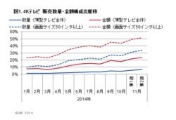 2014年11月第2週(11月3日〜9日)における4Kテレビの販売金額構成比は24%。特に50インチ以上薄型テレビ内では51%と、初めて50%を突破した。また販売数量構成比は、薄型テレビ全体に対しては6%、50インチ以上製品内では34%となった。