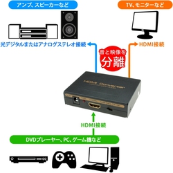 本機を利用することで、テレビの音声だけを別途スピーカーやアンプなどのオーディオシステムに接続して出力することが可能。同社では「普段はテレビのスピーカーを使用しているけど映画などを見る際には専用のオーディオシステムを使用したいという方。または、音声出力が無いモニターを使用しているため音声信号を別途外部アンプや外部スピーカーなどに出力したい方などに便利な商品だ」としている。