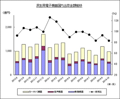 一般社団法人 電子情報技術産業協会(JEITA)は、民生用電子機器の10月度国内出荷金額を発表した。全体では前年比83.1%の975億円で、7ヶ月連続で前年比マイナスとなった。分野別に見ると、映像機器は486億円(前年比91.2%)と4ヶ月連続マイナス、音声機器は59億円(前年比52.3%)と7ヶ月連続でマイナスとなった。
