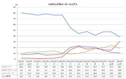 「小型化」の進展はメーカーシェアにも影響。4Kテレビとしては小さめの55型で当初は大きなシェアを握ったソニーだったが、競合各社が40-50型台で比較的小ぶりなモデルを相次いで投入し始めたことで状況が一変。11月時点でもトップは依然ソニーだが、以前のような圧倒的なシェアではなくなった。