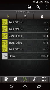 サンプリングレート、量子化ビット数などで楽曲を絞り込み表示することができる点が大きな特徴。たとえばリストから「24bit/96kHz」と書かれた部分をタップすると、合致する楽曲が一覧表示される。もちろん、通常のアプリと同様にアーティストアルバムや曲から選曲することもできる。