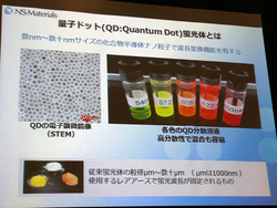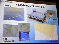 NSマテリアルズは、独立行政法人産業技術総合研究所と共同開発した独自のマイクロ空間化学技術によるLED光源用の新しい蛍光体「量子ドット=QD(Quantum Dot)蛍光体」の量産技術を有する会社。