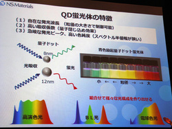 対して量子ドット蛍光体は、ナノメートルサイズの粒径を持つ極小の化合物半導体ナノ粒子によるもの。レアアースを含まず、吸収した光の波長を変換して発光する機能を持っている。発光する色は、粒径の大きさによって決まる。今回NSマテリアルズが発表した量子ドット蛍光体は、従来に比べ約1/1000の大きさとなる数ナノメートル〜数十ナノメートルサイズ。同社では、以下の3つを大きな特徴と説明している。