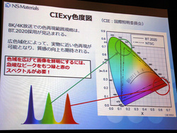 なお、8K/4K放送における色再現範囲規格としてBT.2020の採用が見込まれているが、同社では量子ドット蛍光体を採用することで、現行のNTSC規格の色空間を超え、カラーフィルター等の最適化によってBT.2020規格も100%サポートできるようになると説明している。
