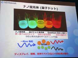 NSマテリアルズ(株)は、同社が開発した量子ドット技術による、高輝度LED光源用高機能ナノ蛍光体について、テレビやモバイル端末における実用化と有効性に関する発表会を開催した。