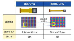 従来パネルでは、画素構造において、RGBストライプ配列内に色純度を確保するための遮光部を配置。配列を最適化することで遮光部を最小化し、画素サイズを小さくすると同時に開口率を96%にまで向上させた。これにより屋外でも使用できる輝度とパネルの超小型(10.2mm×7.9mm)を両立させた。