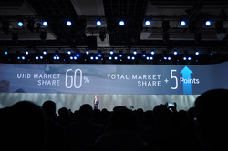 冒頭に登壇したSamsung Electronics America社プレジデント兼COOのTim Baxter氏は、「サムスンはUHDテレビの市場をリードしてきたブランド。商品ラインナップの充実を図りながら、パートナーとともに500を超える4Kコンテンツをオンラインより提供してきた。米国内に8,000を超える体験コーナーを設けて、4Kの魅力をコンシューマーに伝える活動にも注力している。その成果として、米国内での4Kテレビのシェアは現在60%に到達。テレビ製品全体のマーケットシェアも5%アップした」と語る。