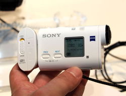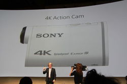 4Kアクションカム「FDR-X100V」も出展。3月に500ドルで販売を開始する。同社としてはじめての4K対応主観視点カメラで、3840×2160 @30p, 15pでの記録が可能。4K記録時の最大ビットレートは100Mbps。