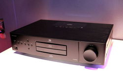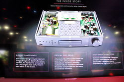 さらに、同じくプレスカンファレンスで話題をさらった、最薄部9mmという超薄型4K液晶テレビも登場。係員がテレビを回転させ、その薄さをアピールしていた。電源部やチューナー部なども、ディスプレイ背面下の、T字型に盛り上がっているところに収納されているのがポイントだ。