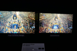 ソニーは2015年モデルのブラビア「X940C」の75型モデル(同サイズのみ直下型バックライトを採用している)で、HDRのデモを実施していた。このHDRには、同社が以前から採用している、画面内の一部ブロックのLEDに電力を集中させる技術を用いている。なお画面輝度は非公表だが、画面全体の輝度確保よりも、瞬間・部分的な突き上げを重視している。
