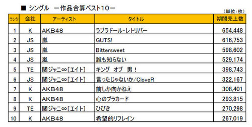 シングルは嵐「GUTS! (CD+DVD)(初回生産限定盤)」が1位となった。なおシングルは1位から5位までの独占に加え10位も嵐。7位から9位も関ジャニ∞[エイト]が占め、特にジャニーズの強さが目立った。