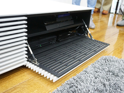 プロジェクター部は、電源のオン/オフに連動して天面カバーが自動開閉。電源オフ時には天面がフルフラットになることでホコリの侵入を防ぐとともに、投写口の存在を消す。これに代表されるように、未使用時に住空間を邪魔しないデザインを意識したという。