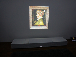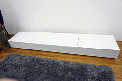 製品はプロジェクター本体、スピーカー、周辺機器などを収納するキャビネットという3つのパーツで構成。17cmという、製品を壁にほぼピッタリと近づけて設置した状態で最大147インチでの投影が可能。壁へ完全に寄せて設置した場合でも最大106インチで投影できる。壁際に設置することで投写映像に人の影が映り込むことがなく、生活動線を妨げないというメリットがある。