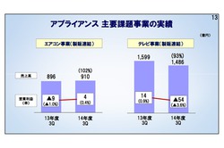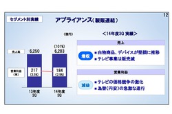 セグメント別では、液晶テレビや白物家電を含むアプライアンス部門は、3Qの売上高が6,283億円(前年同期比101%)、営業利益184億円(同85%)。1〜3Q累計では売上高1兆3,807億円(前年同期比101%)、営業利益446億円(同168%)となり、利益を伸ばした。