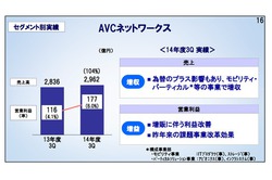 デジタルカメラ等を含むAVCネットワークスは、3Qのみだと売上高2,942億円(同104%)、営業利益177%(同153%)。1〜3Q累計では売上高8,278億円(前年同期比99%)とやや落としたものの、営業利益は同234%となる216億円へと大きく伸ばした。