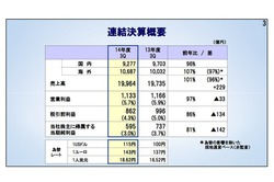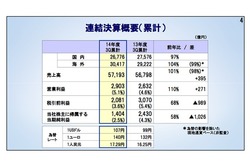 1Q〜3Qまでの累計売上高は5兆7,193億円(前年同期比101%)。営業利益は2,903億円(同110%)と伸びたものの、税引前利益は2,081億円(同68%)、当期純利益は1,404億円(同58%)と減益に転じた。これは、前年同期は有価証券売却益を営業外収益に計上したことや、家庭用ヒートポンプ給湯器の事故防止対策費用を営業外費用に計上したことなどによるものと説明されている。なお2014年度通期予想は据え置いた。