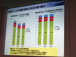 そして国内のカーナビ市場について、消費税増税の反動もあって2014年は台数前年比90%となる見込みで、2015年も厳しい状況が続くと予想しているとする一方で、高価格帯の構成比が高まっていることも紹介。「強力な商品だと思っている」という今回の新モデルを投入する背景について説明した。