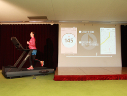 会場では、実際にルームランナーを使用したデモンストレーションも実施された。Smart B-Trainerを装着してルームランナーを走ったモデルの女性は「音楽にあわせて走ることができるので、とても走りやすいです」とコメントしていた。