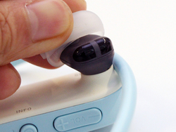 付属イヤーピースは、通常のシリコンチップと防水用チップをそれぞれ4サイズずつ付属している。そのほか、充電用のクレードルも同梱している。
