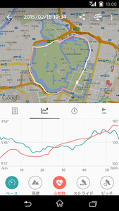 ランニング終了後は計測したログをBluetooth経由でアプリに転送し、走ったコースや脈拍数の変移などのデータを確認することができる。