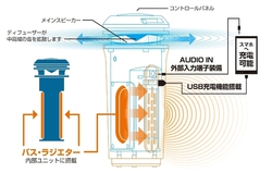 出力は8W。内部ユニットに大型バス・ラジエーターを2つ搭載する。同社は「ここから発生した重低音が低音用ダクトから放出され、コンパクトボディとは思えない驚異の重低音を実現した」とアピールしている。