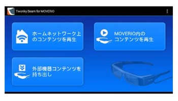 実際にアプリを立ち上げると、「ホームネットワーク上のコンテンツを再生」「MOVERIO内のコンテンツを再生」「外部機器コンテンツを持ち出し」の各メニューが表示される。