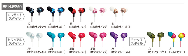 カラーバリエーションについては、スタンダードモデルのRP-HJE260のみ合計12色と豊富。エレガントピンク/エレガントゴールド/エレガントブルー/エレガントレッド/エレガントブラックの「エレガントスタイル」5色、カジュアルピンク/カジュアルパープル/カジュアルブルー/カジュアルレッド/カジュアルホワイトの「カジュアルスタイル」5色、マルチカラー/カモフラージュの「ミックススタイル」2色をラインナップする。