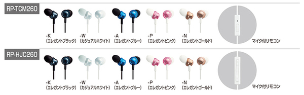 なおプラグ形状は、スタンダードモデル RP-HJE260が金メッキ製のL型3.5mmステレオミニプラグで、そのほかのRP-TCM260とRP-HJC260が金メッキ製のL型3.5mm4極ステレオミニプラグを採用している。