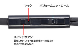 MM-HS705は、ケーブル部分にマイク付きリモコンスイッチを備え、片手で通話のオン・オフの操作が可能。また、ハンズフリー通話も可能。その他、ボリュームの調整、音楽の再生・停止や曲送り・曲戻しの操作が行える。