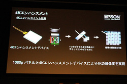 技術的な特徴はセイコーエプソン(株)VP企画設計部 部長の小西正祐氏が紹介した。レーザー光源、反射型パネル、4Kエンハンスメントなどについてくわしく紹介した。