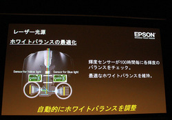 またレーザー光源のホワイトバランスを最適化するため、内蔵した輝度センサーが100時間ごとにブルーとイエローの光をチェックし、バランスを確認する機能も搭載。自動的にホワイトバランスを調整するため、最適なホワイトバランスを維持できる。なお、この調整機能を手動で行うことはできない。